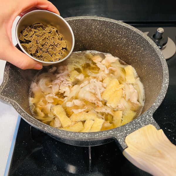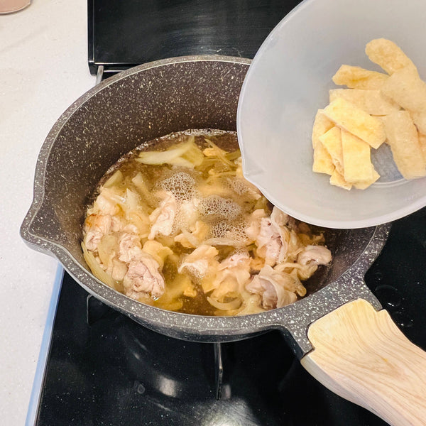 Beyond these core ingredients, you can add whatever you like. There are no strict rules for additional ingredients. In this recipe, I chose pork, onion, aburaage (deep-fried tofu pouches), and green onion, but you can also use other meats and vegetables, such as chicken, beef, carrots, and mushrooms.
