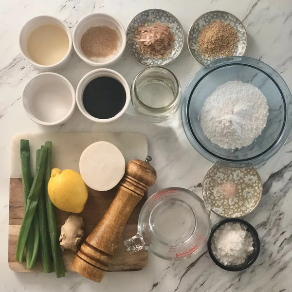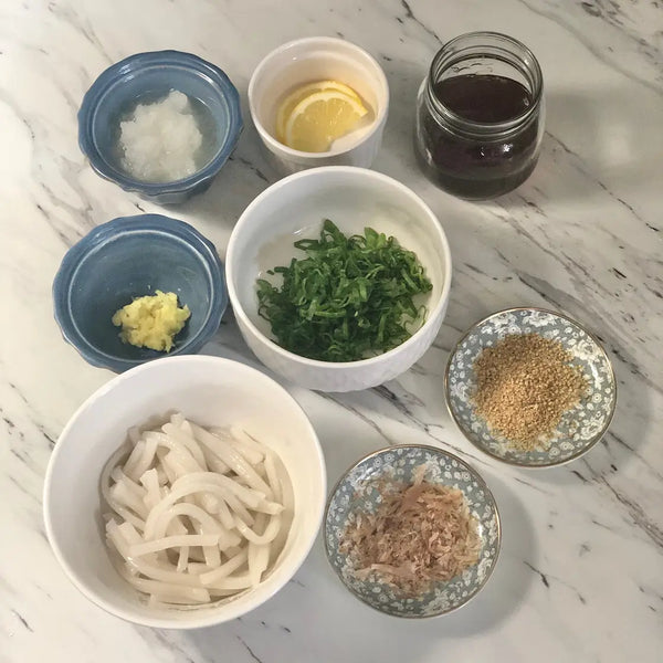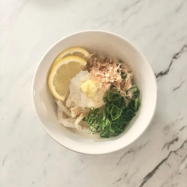 Cold bukkake udon is all about balance. The noodles are cool and smooth, while the broth delivers clean, savory flavor. Toppings play an important role and can be adjusted to taste. Popular garnishes include grated daikon radish for freshness, grated ginger for gentle heat, chopped green onions for sharpness, and sesame seeds for nutty aroma. Bonito flakes add an extra layer of umami, but they can be omitted if you prefer a fully plant-based bowl.