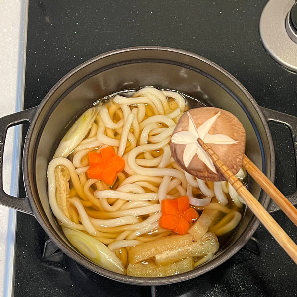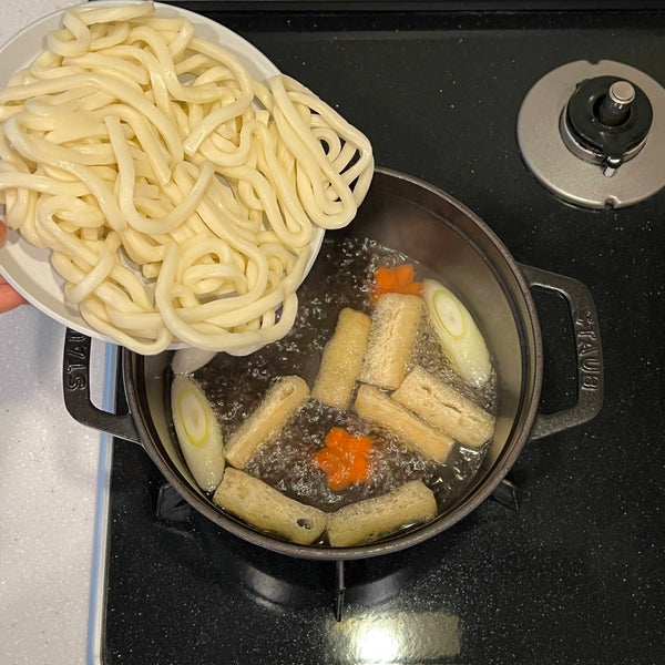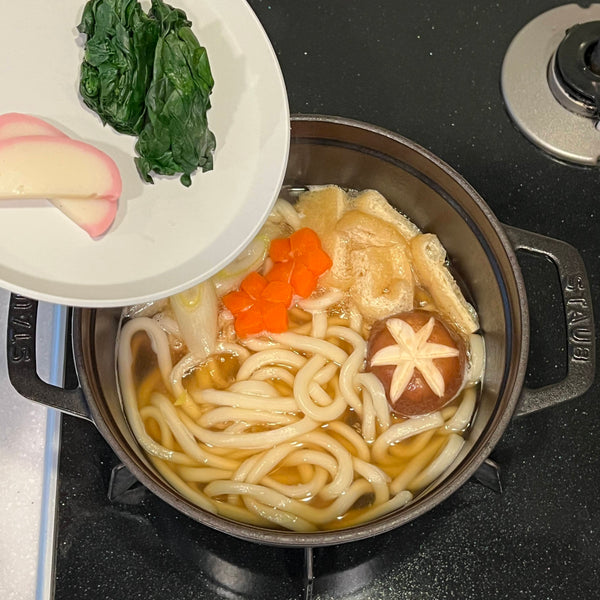 Traditionally, nabeyaki udon is made with thick udon noodles and various toppings such as kamaboko fish cake, shiitake mushrooms, deep-fried tofu pouch, egg, and more, all simmered in a savory dashi and soy sauce-based broth.