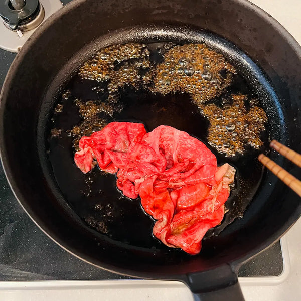 - "Warishita" is used as the seasoning: For Kanto-style Sukiyaki, Warishita is used as the seasoning base, and the ingredients are simmered in it. Warishita is a sauce made of sugar, soy sauce, mirin, and sake, all of which are mixed together beforehand. In contrast, Kansai-style Sukiyaki doesn’t use "Warishita." Instead, it requires adding seasonings such as sugar and soy sauce one by one while checking the overall taste. This difference stems from the fact that Kanto-style Sukiyaki started its history from "Gyu-nabe (beef hot pot)" in which the ingredients are simmered with a seasoning sauce.