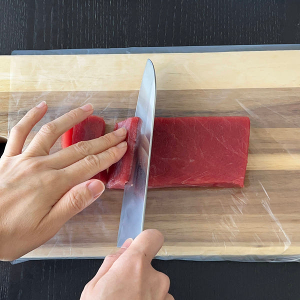 Slice the tuna diagonally with your hand lightly resting on it. When slicing, tilt the knife to the right or left, then place the base of the knife on the fish and cut in one smooth motion, pulling the knife towards you without any pushing or back-and-forth movement.