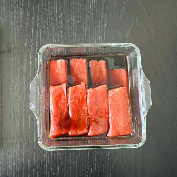 Marinate the sliced tuna in the marinating sauce (from step 2), preferably in a shallow container to ensure every slice is evenly coated. *Make sure the marinating sauce has cooled down before adding the tuna.
