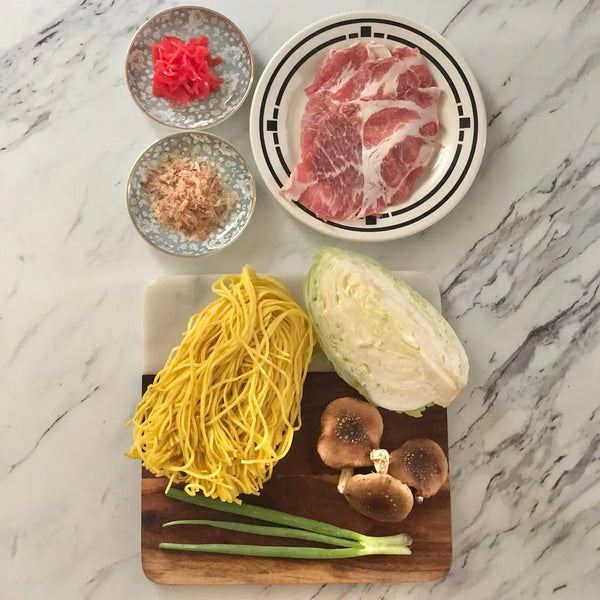 In this recipe, we’ll be showing you the most classic version of yakisoba that you can make in the comfort of your own home. We’ll add thin slices of pork, cabbage, green onions, and shiitake mushrooms to our yakisoba, and finish it off with a delicious homemade yakisoba sauce.