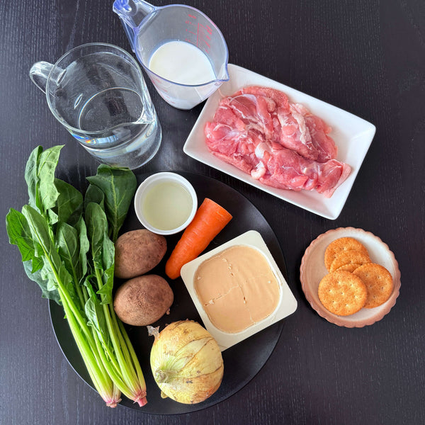 Vegetables (Onion, Carrot, Potato, Spinach) - Onion adds sweetness and umami, while carrot brings vivid color. Potatoes become silky and add a rustic touch, and spinach gives melty leaves with crunchy stems.