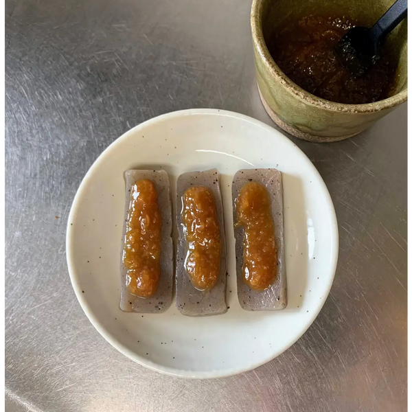 The origins of dengaku miso date back to the Eiroku period (1558–1570), when skewered and grilled tofu topped with miso paste became popular in Japan. The name "dengaku" was inspired by the skewered tofu’s resemblance to the dengaku-houshi, a man who danced to worship the god of rice fields and prayed for a good harvest during planting season.
