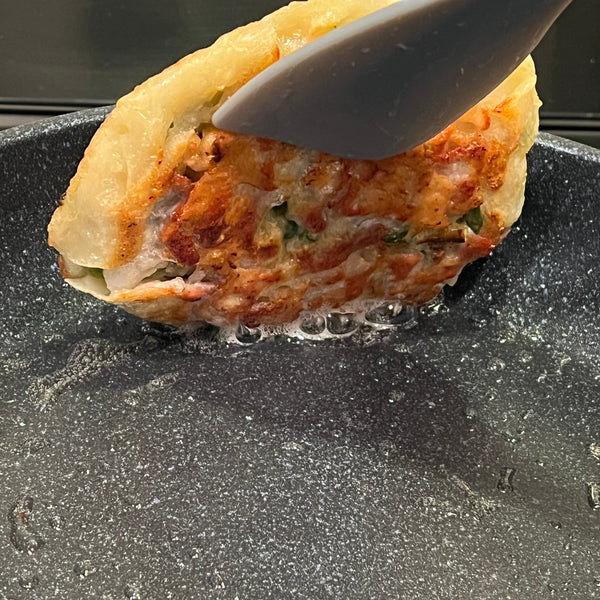 Secondly, the basic batter: Usually, Okonomiyaki is made with a one-to-one ratio of all-purpose flour to water. In contrast, Negiyaki uses a one-to-one (or more) ratio of flour to water, resulting in a lighter texture that highlights the Negi more clearly.
