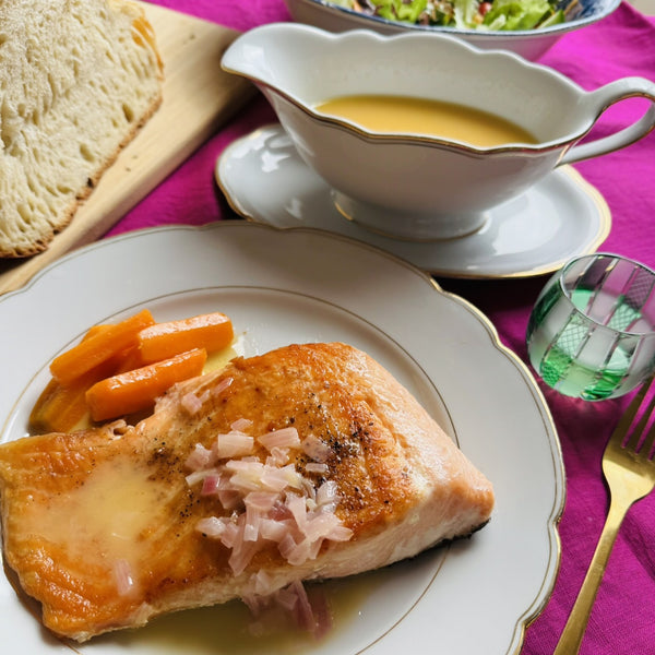 To prepare it, you’ll need high-quality salmon fillets, skin-on. The sauce calls for butter, finely minced shallots, sake (or white wine, if you prefer), lemon juice, and a pinch of salt. The full beurre blanc recipe is wonderfully simple, yet the key is in timing and temperature, keeping the emulsion stable while creating a silky texture.