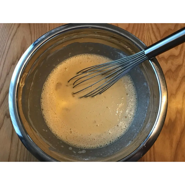 Mix the water and egg thoroughly, then gradually add in 150g of the takoyaki flour. This will result in a very fine batter, and the takoyaki will be very delicious. Pro Tip: Do not mix the flour first!