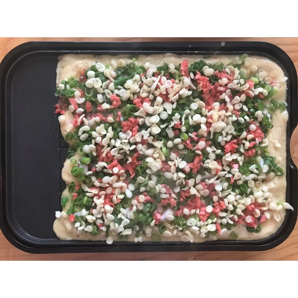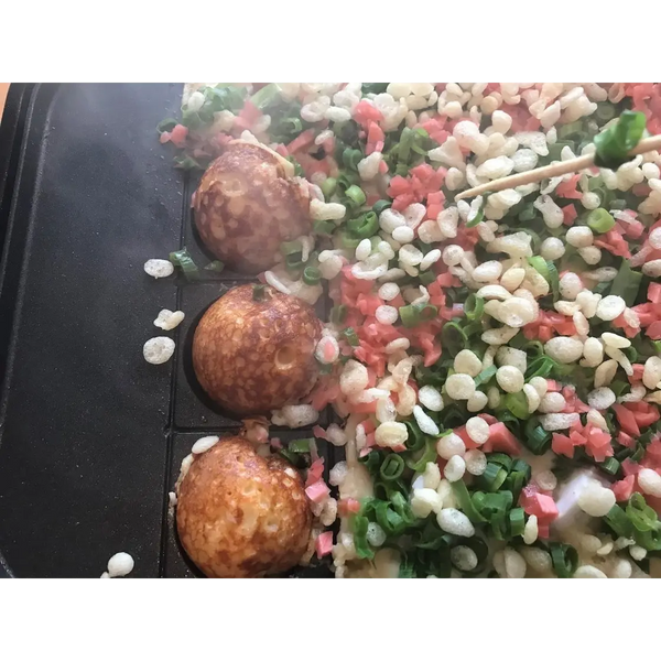 Add your fillings to the pan: octopus or alternative filling, tenkasu, green onion, and red ginger, in that order.
