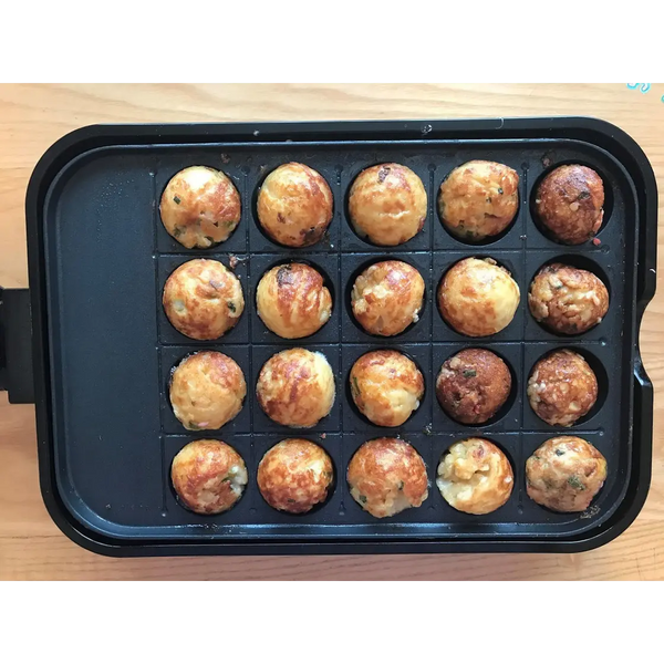 Heat up the takoyaki electric grill or pan and evenly spread a generous amount of oil around so that you can see it pooling at the bottom of the round holes.