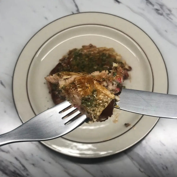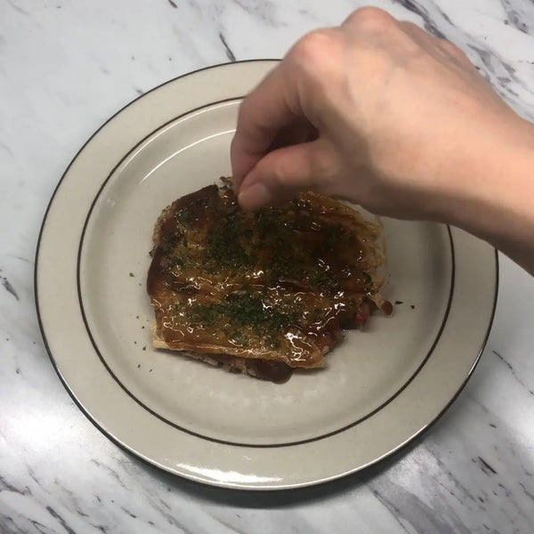 And what's Okonomiyaki without its signature toppings? Homemade vegan okonomiyaki sauce, vegan mayo, and a sprinkle of nori step up to the plate, giving you tangy, sweet, and umami-packed bites in every mouthful.